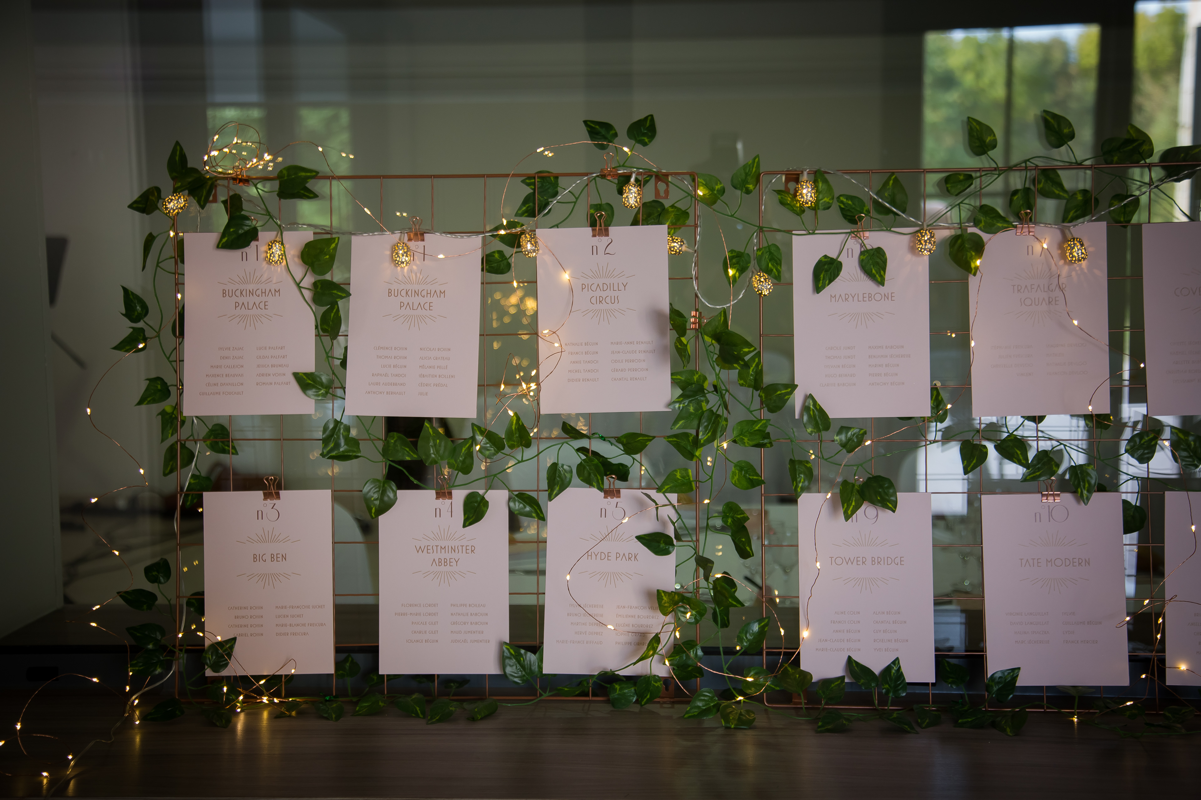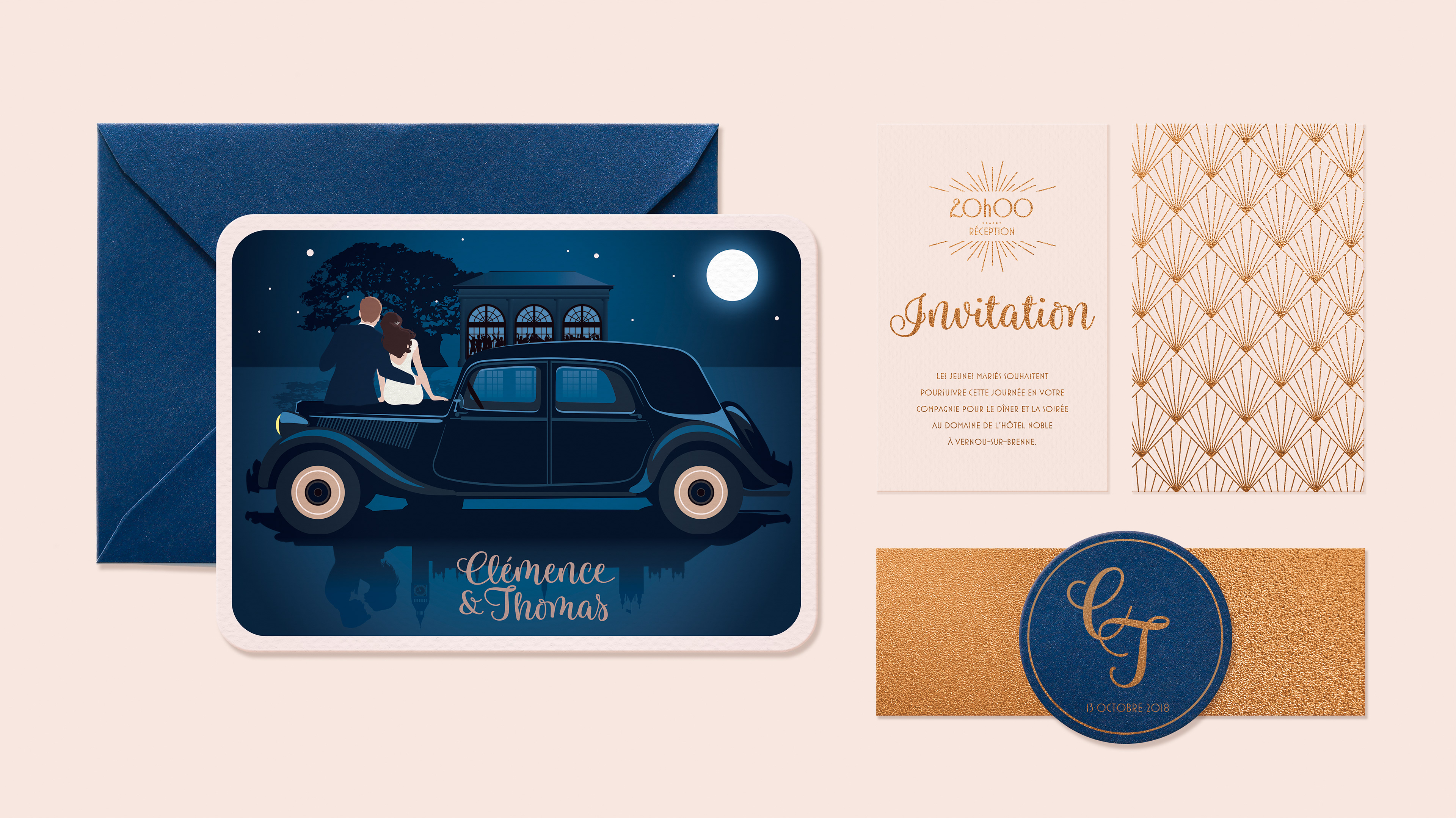 Illustration personnalisée et création du faire-part, du carton d'invitation et des menus en collaboration avec l'atelier de sérigraphie Fwells à Paris. Création de la décoration globale du mariage : salle, jardin et voiture des mariés.